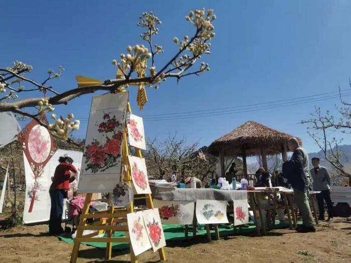 乡村书画家在活动现场作画。梨花谷雨休闲季期间,游客可参与梯田风筝节、象棋公开赛(冠军奖金3万元)、斗蛋文化节等20余项活动,品尝梨窖火锅、泉水宴、桃湖烤鱼,体验认养一亩田、逛农村小集、骑行等田园项目。