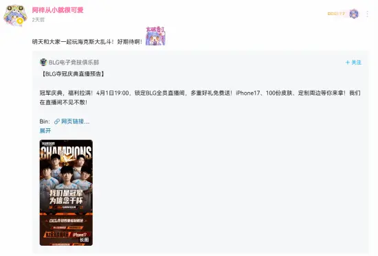 4月1日19:00,BLG夺冠盛典直播,官方安排了人气虚拟主播“阿梓从小就很可爱”与BLG选手进行联动。然而,直播过程中的氛围却让不少观众感到“脚趾抠地”: